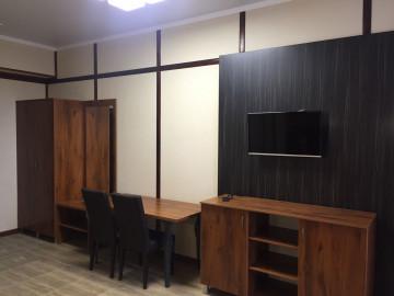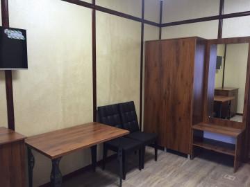 Двуспальная 180*200 и двухъярусная 100*200 кровать, прикроватные тумбы, гардеробный шкаф с зеркалом, пенал, багажная полка, стол, стулья, холодильник, система внутренний связи(мини атс), электрочайник, сейф, ночной бра, набор чайной посуды, фен, телевизор, кондиционер, санузел с душевой кабиной. Дополнительное место предусмотрено.