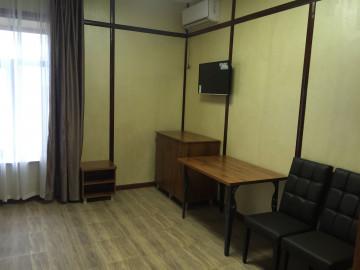 Двуспальная 180*200 и односпальное 90*200 кровать, прикроватные тумбы, гардеробный шкаф с зеркалом, пенал, багажная полка, стол, стулья, холодильник, система внутренний связи (мини атс), электрочайник, сейф, набор чайной посуды, ночной бра, фен, телевизор, кондиционер, санузел с душевой кабиной. Дополнительное место предусмотрено.