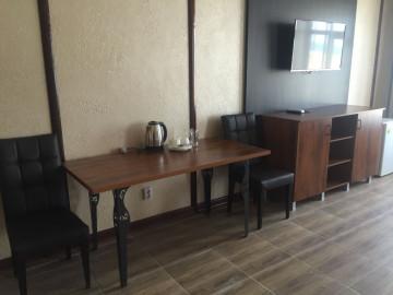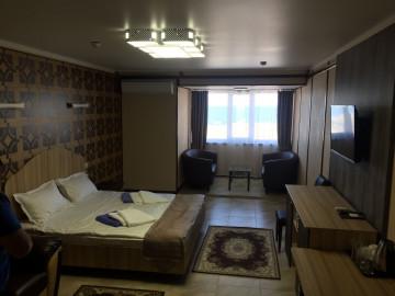 Двуспальная 160*200 кровать, прикроватные тумбы, гардеробный шкаф с зеркалом, багажная полка, стол, стулья, холодильник, система внутренний связи(мини атс), электрочайник, сейф, ночной бра, набор чайной посуды, фен, телевизор, кондиционер, санузел с душевой кабиной. Дополнительное место предусмотрено.