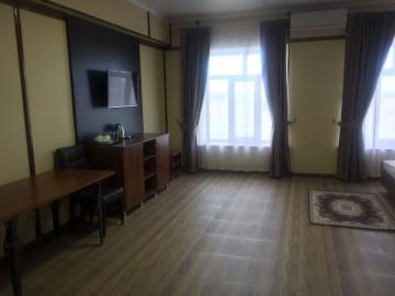 Двуспальная 160*200 кровать, прикроватные тумбы, гардеробный шкаф с зеркалом, пенал, багажная полка, стол, стулья, холодильник, система внутренний связи(мини атс), электрочайник, сейф, ночной бра, набор чайной посуды, фен, телевизор, кондиционер, санузел с душевой кабиной. Дополнительное место не предусмотрено.