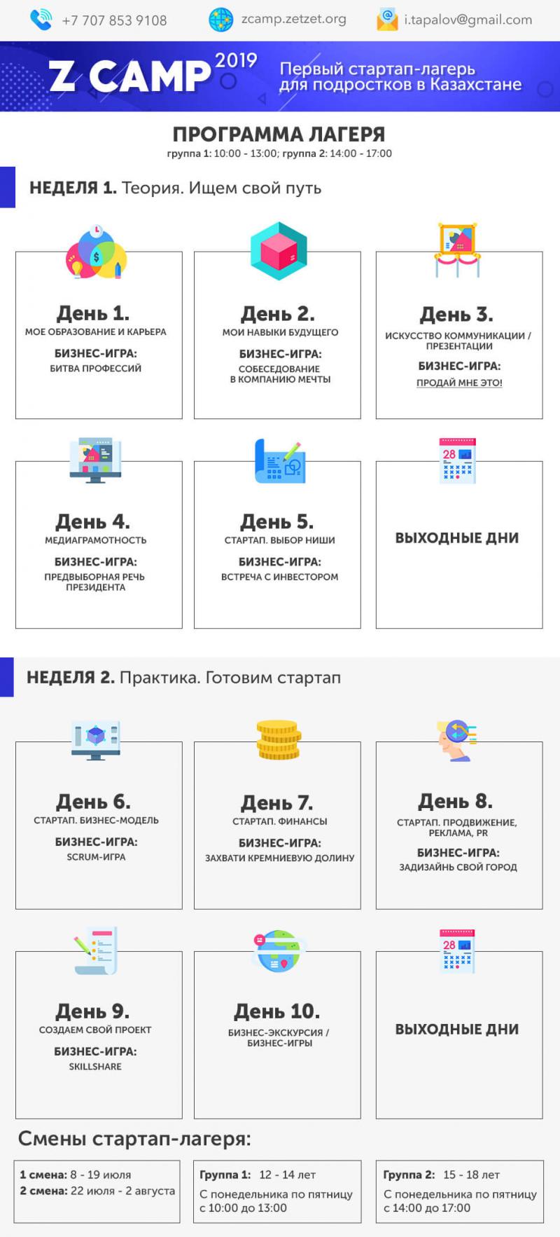 Наш мир меняется под влиянием технологий. Каждый день появляются новые стартапы (технологические компании), интернет-сервисы и тренды. Те, кто их создают, являются самыми востребованными и высокооплачиваемыми профи в мире. Миссия Z CAMP – помочь сегодняшним подросткам стать успешными в том, что им нравится. Программа состоит из 10 тем и 10 бизнес-игр. В конце каждый участник готовит свой проект и защищает его.
